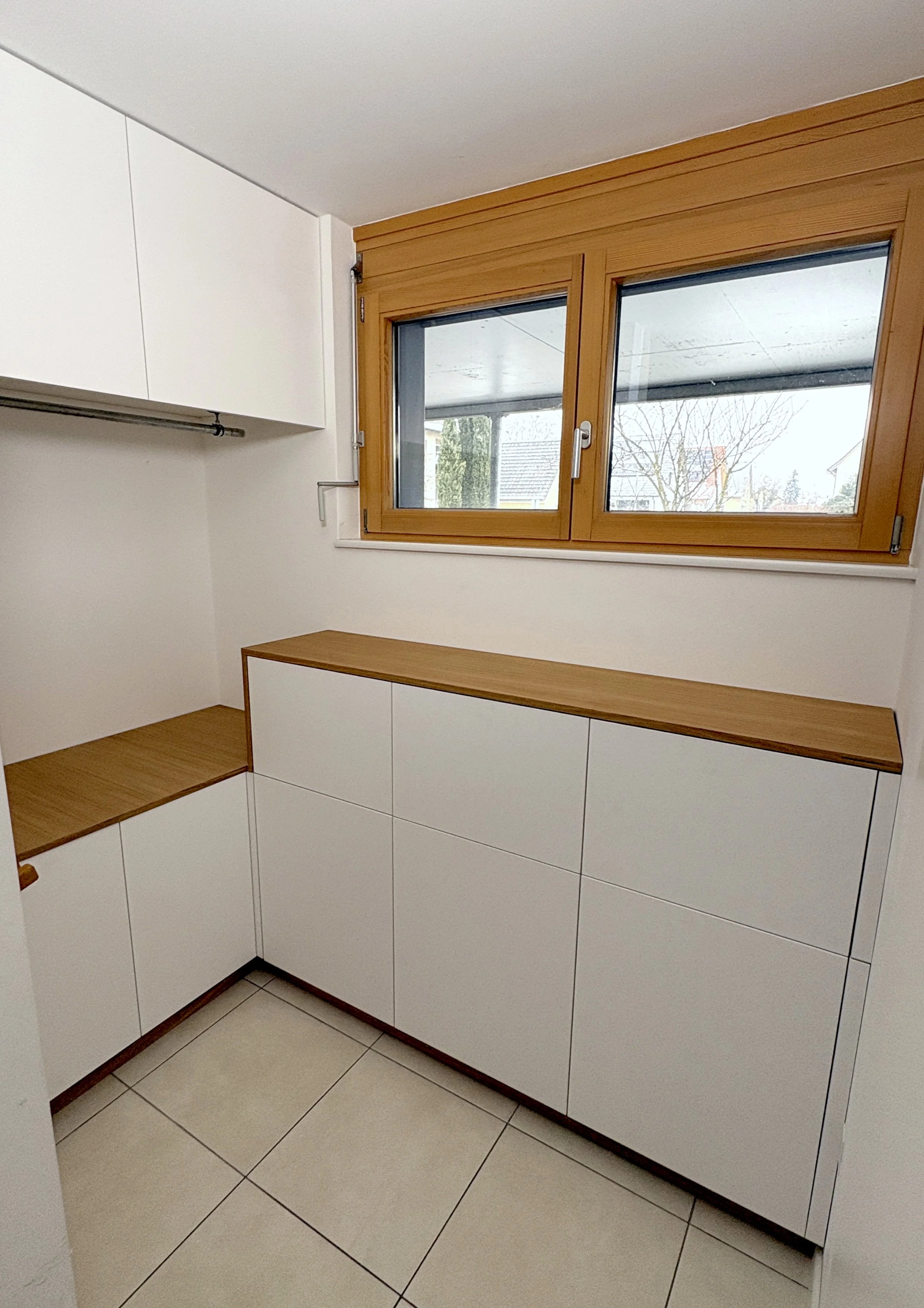 Intérieur moderne avec placards blancs et niches en bois, couloir lumineux, sol en carrelage gris, lumières encastrées au plafond, porte ouverte menant à une pièce éclairée par de grandes fenêtres.