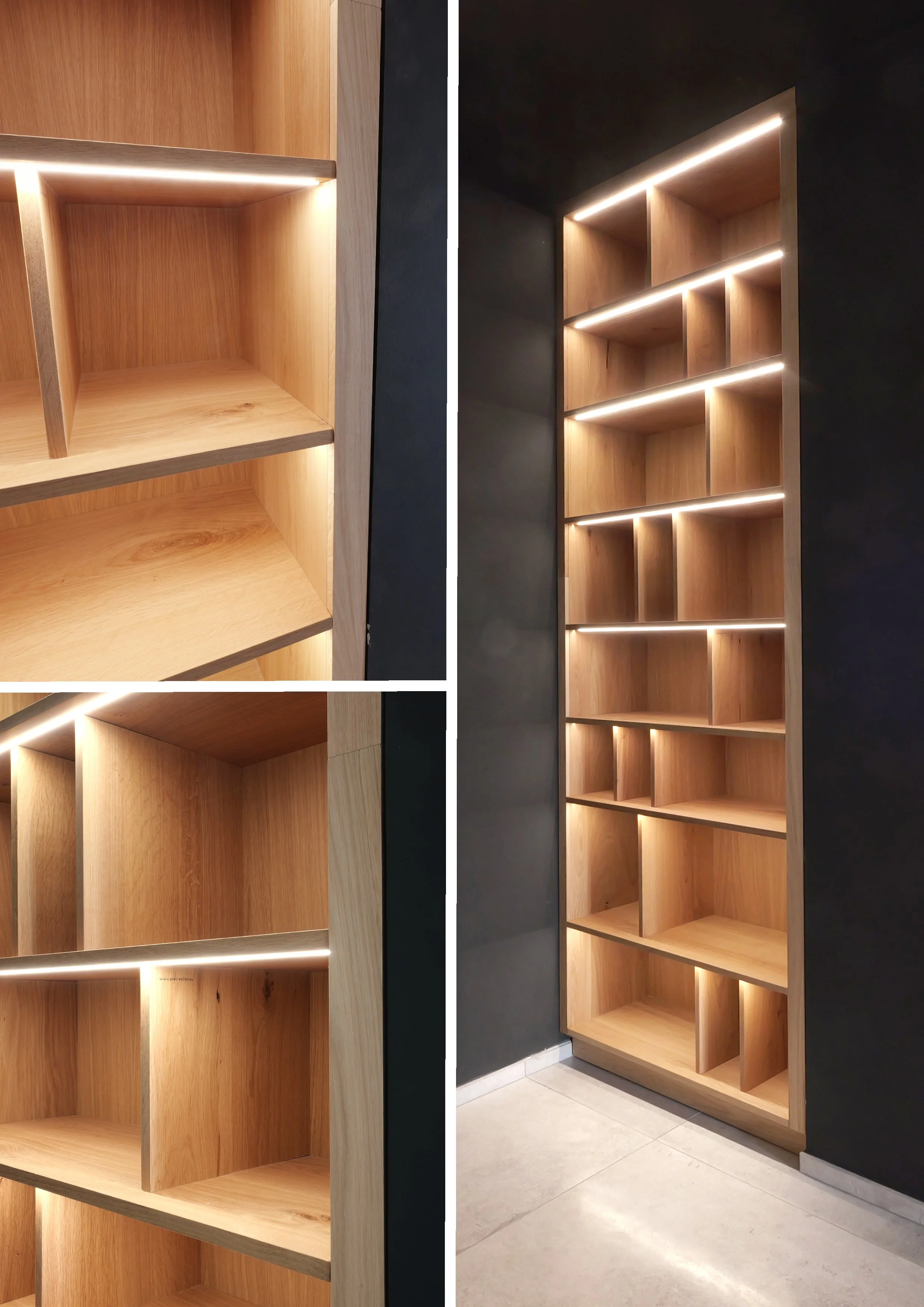 Ce meuble complètement intégré mesure 2,70m de haut et 0,95 cm de largeur, la profondeur de 38cm permet de ranger les plus gros livres sans soucis. Agrémenté de bandeaux LED encastrés dans les tablettes et d’un interrupteur invisible a intensité variable, effet WOW assuré